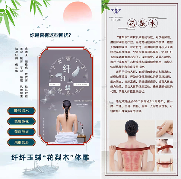 ?養(yǎng)生理療和?體雕塑形一步到?位,形體?抗衰領(lǐng)域的先鋒?,安全快速無痛苦的體?雕,用特色“花梨木”結(jié)合產(chǎn)品,梳理?人體經(jīng)絡(luò)肌肉,調(diào)?整脊柱,養(yǎng)?骨(拉筋伸?骨)7—15天平拉?伸背,排濕毒?,通筋活絡(luò)?,增強身體自由基代謝能力,?其對治療:肩周炎、頭痛、肩頸痛、福?貴包等可一次?見效果!?補充身體元氣,調(diào)理亞健?康!